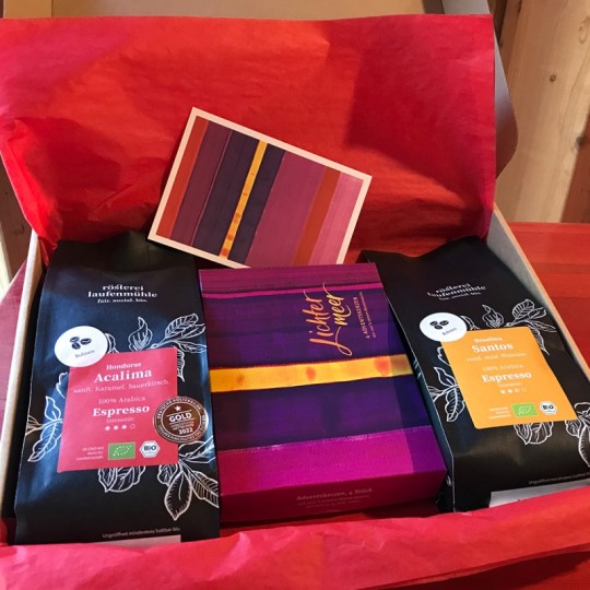 Kaffeegenuss bei Kerzenschein: Mit Sorgfalt zusammengestellt haben wir dieses adventliche Geschenkset - mit duftenden Bienenwachskerzen und feinen Arabica-Espresso-Röstungen aus Brasilien und Honduras. Auf der beiliegenden Karte können Sie individuelle Grüsse für den Beschenkten ergänzen.