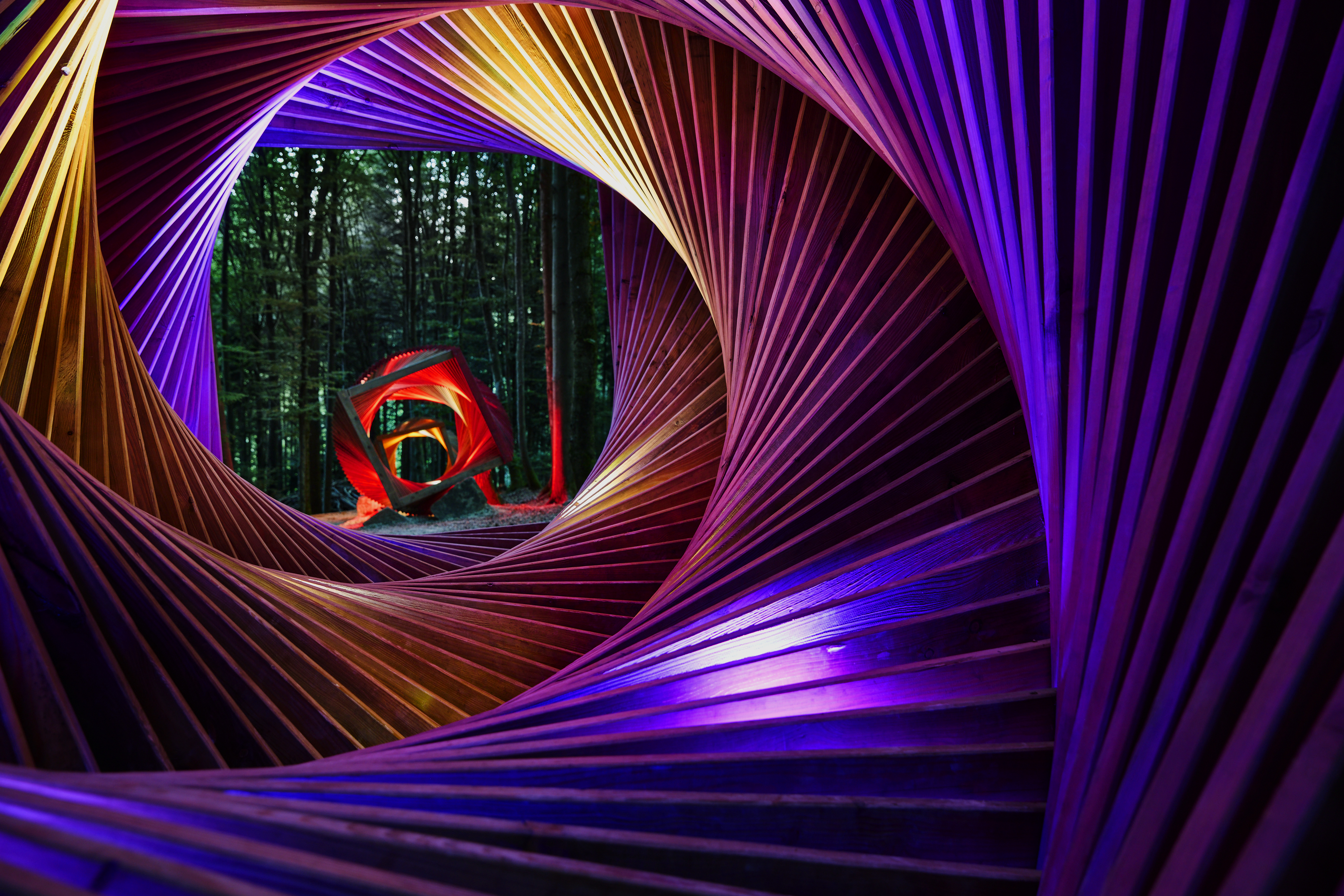 Wenn die Dunkelheit den Wald umhüllt, erwachen Kunstwerke und LandArt-Stationen in faszinierendem Licht zu neuem Leben. Erl…